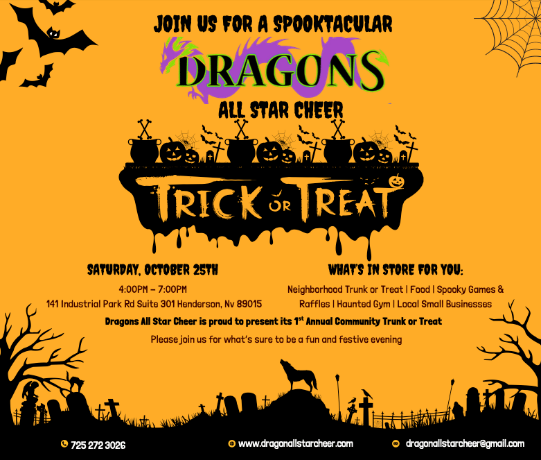 We’re also kicking off the Halloween season a week early by joining Dragon All Star Cheer’s Trunk or Treat event on Saturday, October 25th, from 4–7 PM! It’s shaping up to be a fun and safe evening for both our athletes and the community.